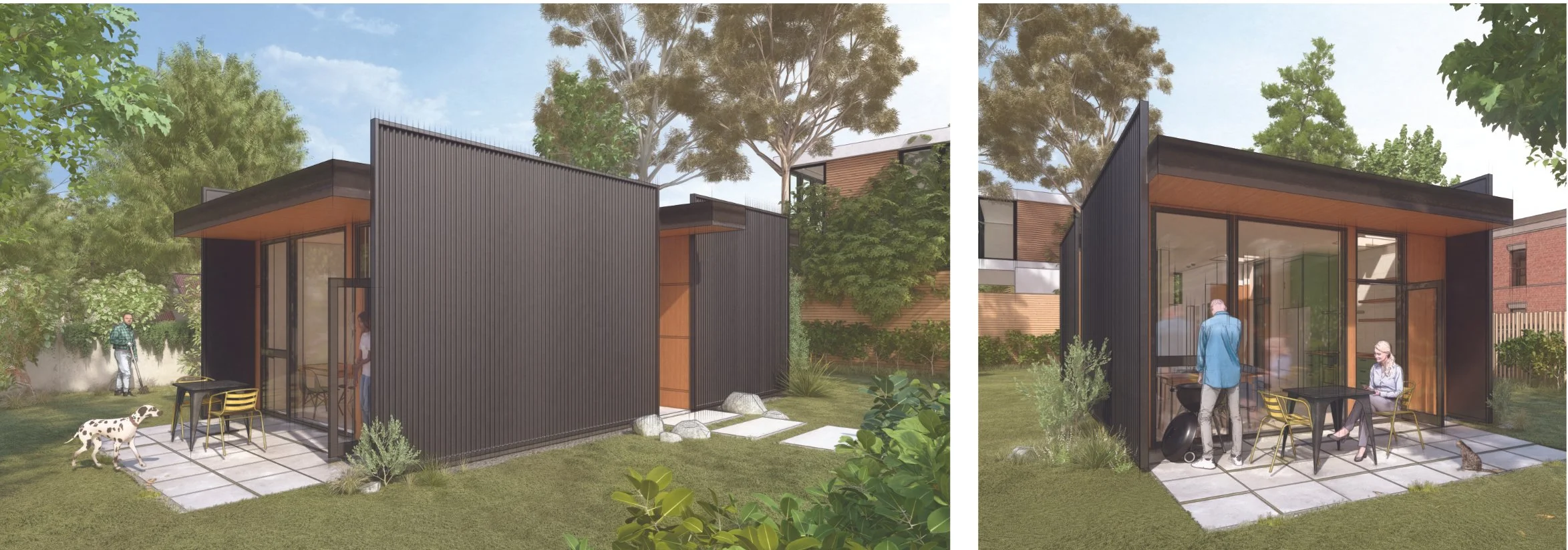 The Sakura has a compact footprint that fits on even the smallest allowable lot. The living space is oriented to a patio that can face a side yard or an alley, depending on site, solar orientation, and owner preference. The house is designed to sit low on lots with some slope, respecting neighbors and daylight. This small footprint and shallow foundation works well with existing trees.