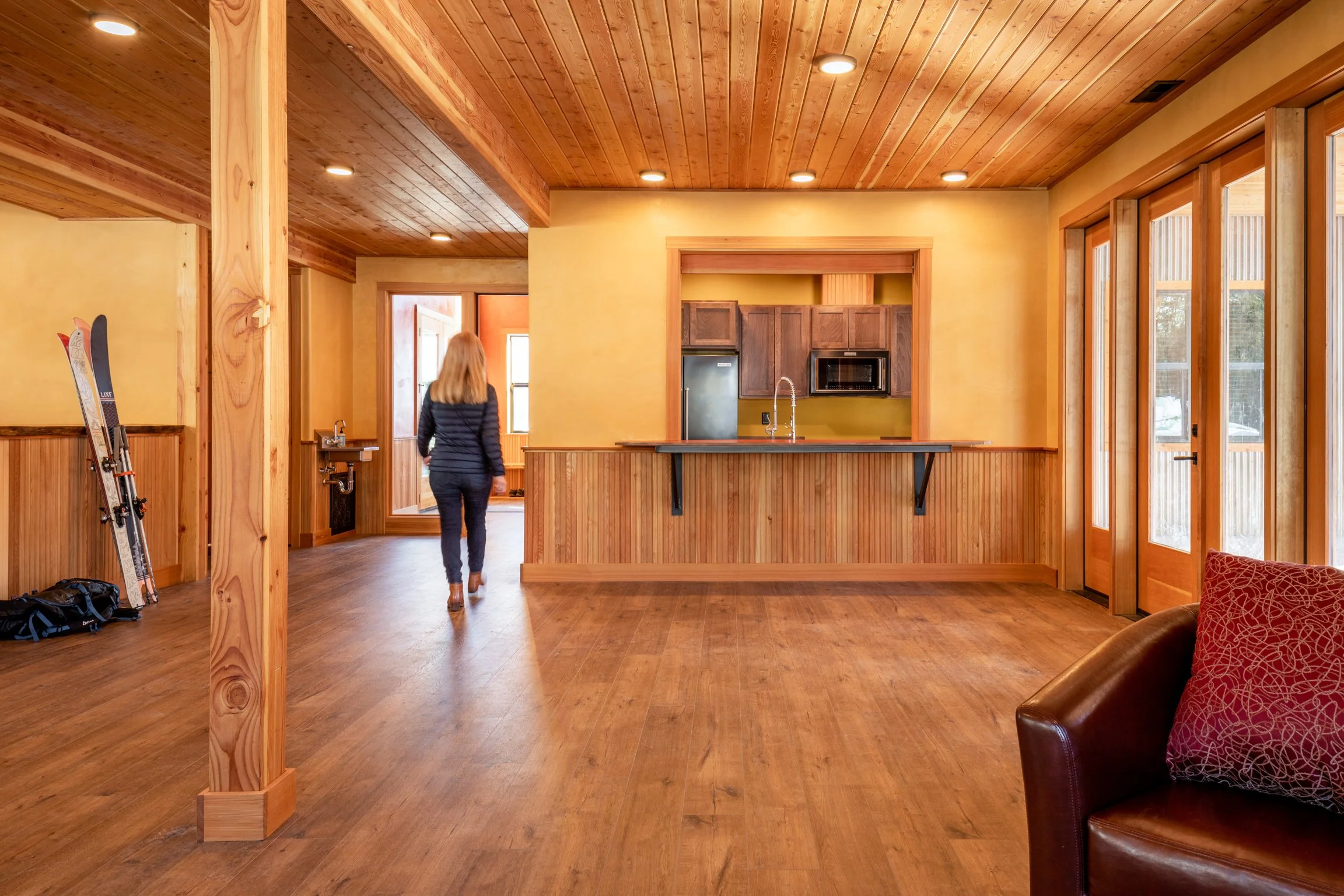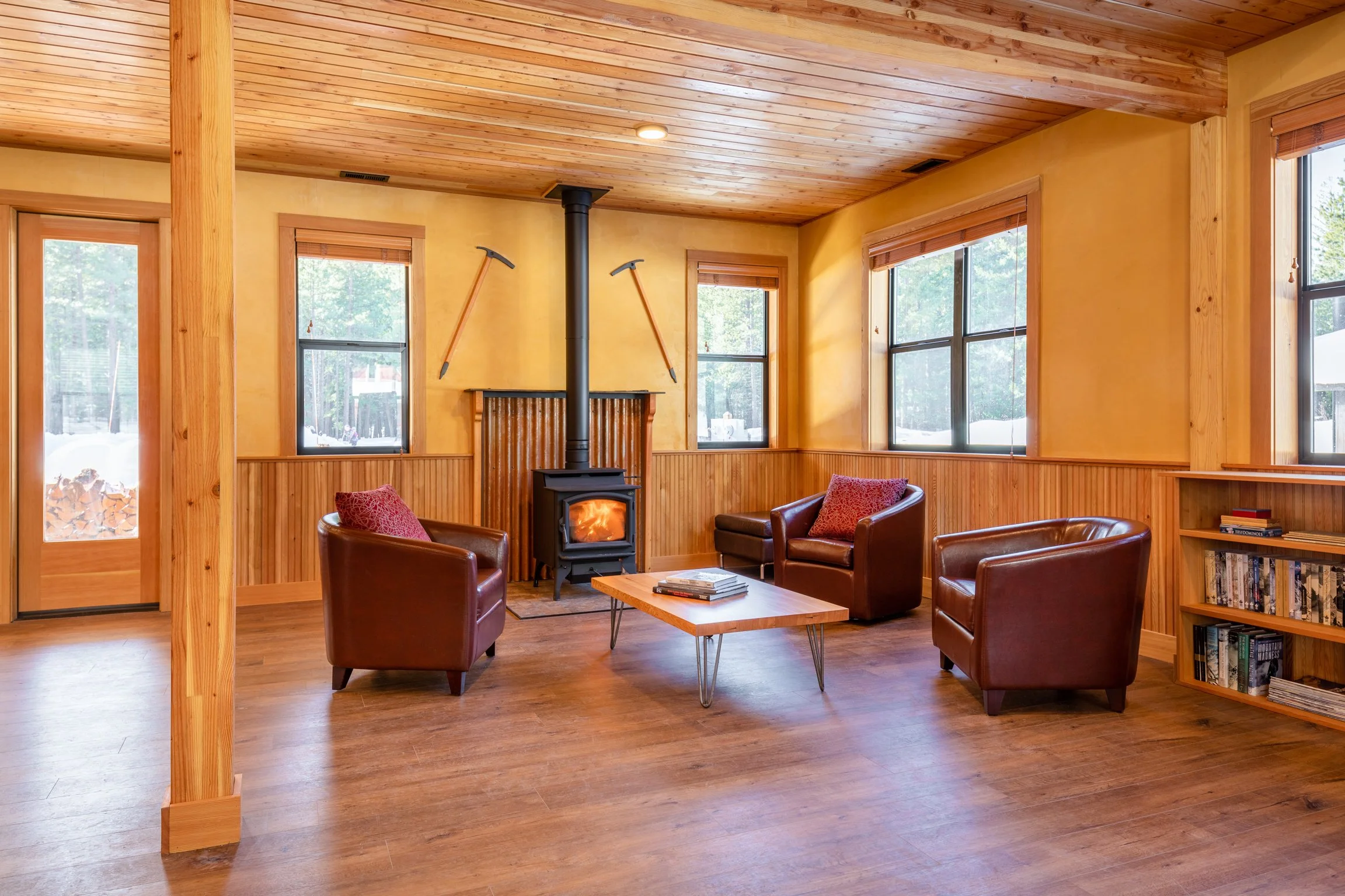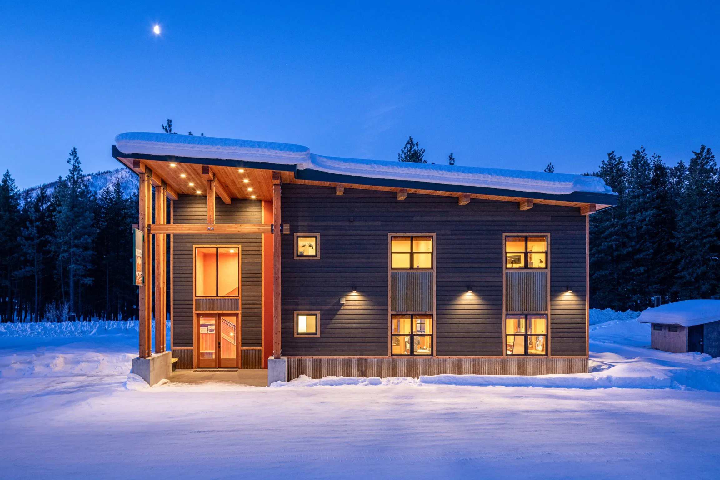 The palette of weathered steel, wood structure, and dark stained wood siding complement the local architectural style and natural environment. The corrugated steel along the wall base protects against snow freeze and thaw in the winter and the sun’s UVs in the summer. The building’s design and construction materials are meant to withstand the Methow Valley’s extreme weather fluctuation.