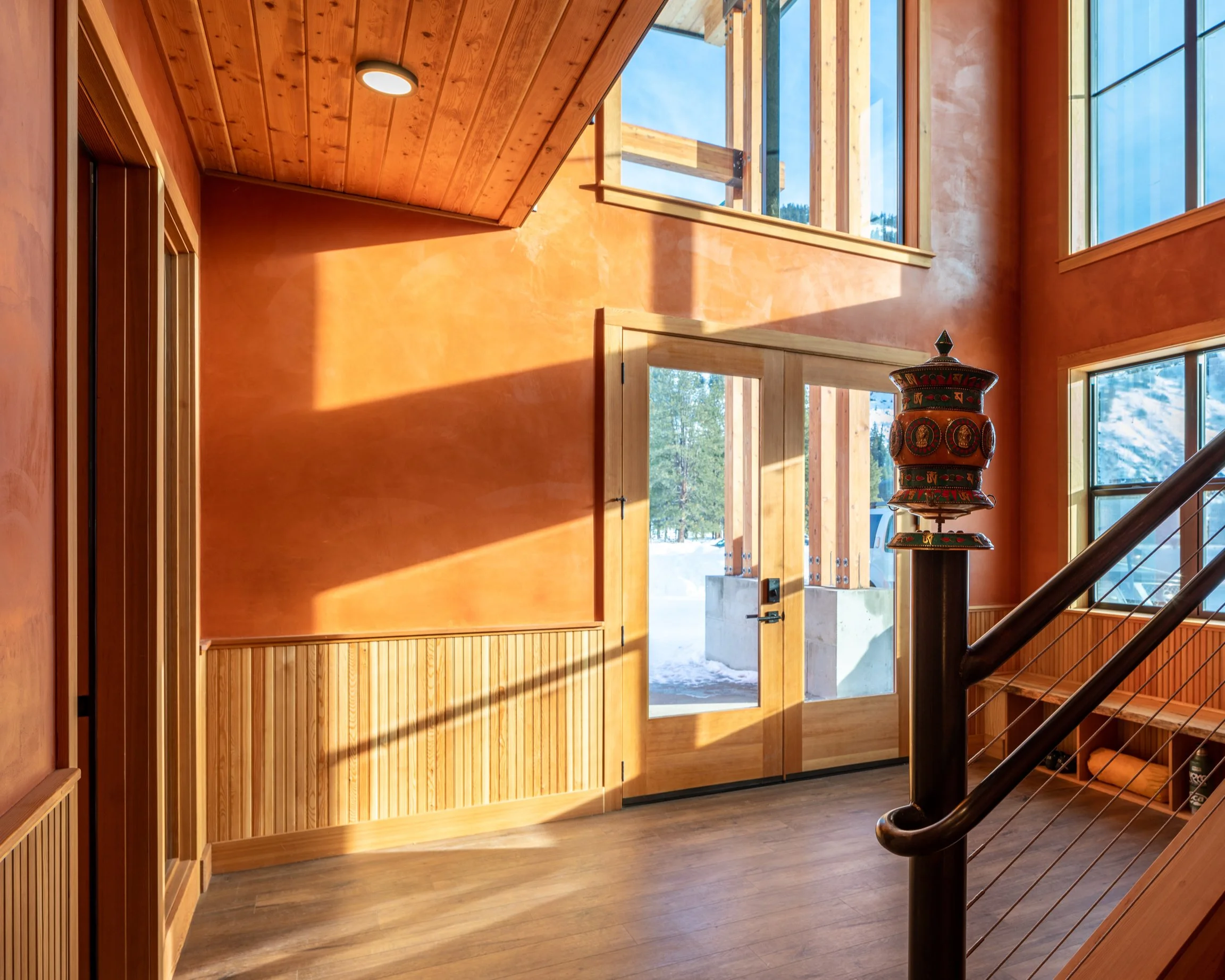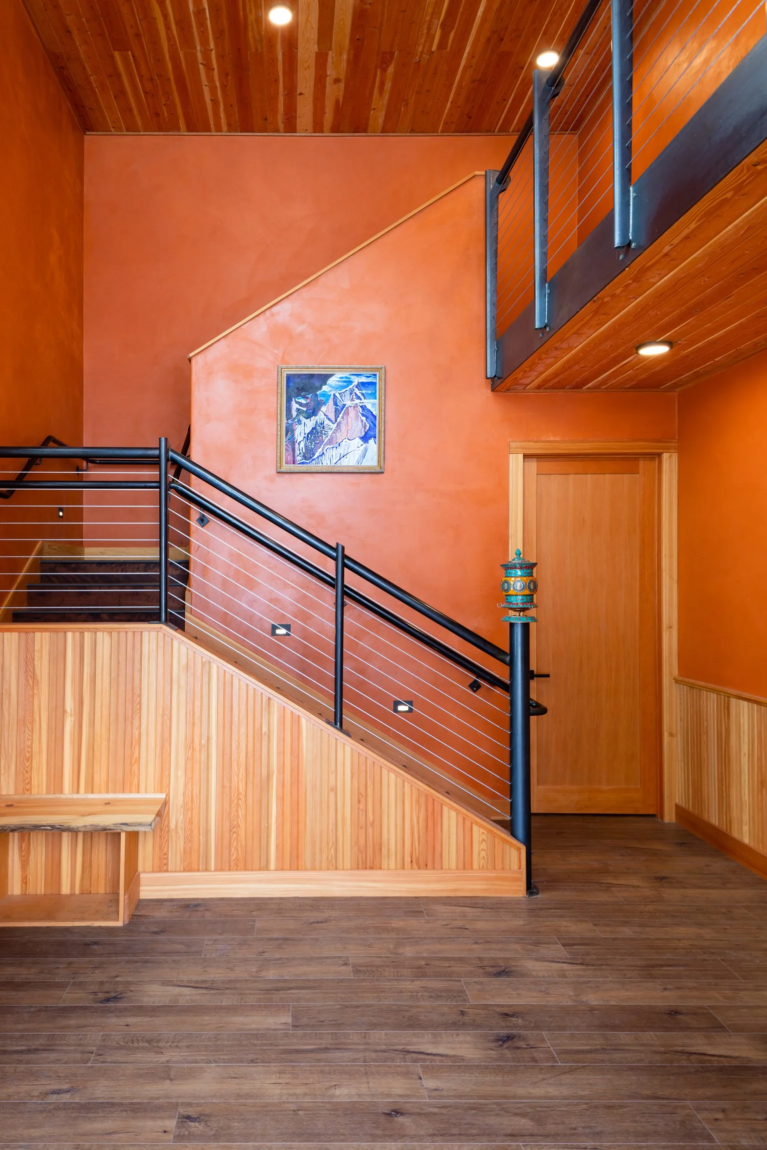 As a welcoming gesture to visitors to the town, a covered patio is oriented toward the main street and opens toward the adjacent property designated as a future park. The single-level street side brings the building to a pedestrian scale. The double-height entry at the back signifies the main entry, which may also be used as a rock-climbing area. Details of the sunny entry and staircase include warm woods, a piton inspired banister welded by a craftsman in Twisp, and a Tibetan Prayer Wheel. Covered exterior spaces allow for client training and small outdoor gatherings all year.