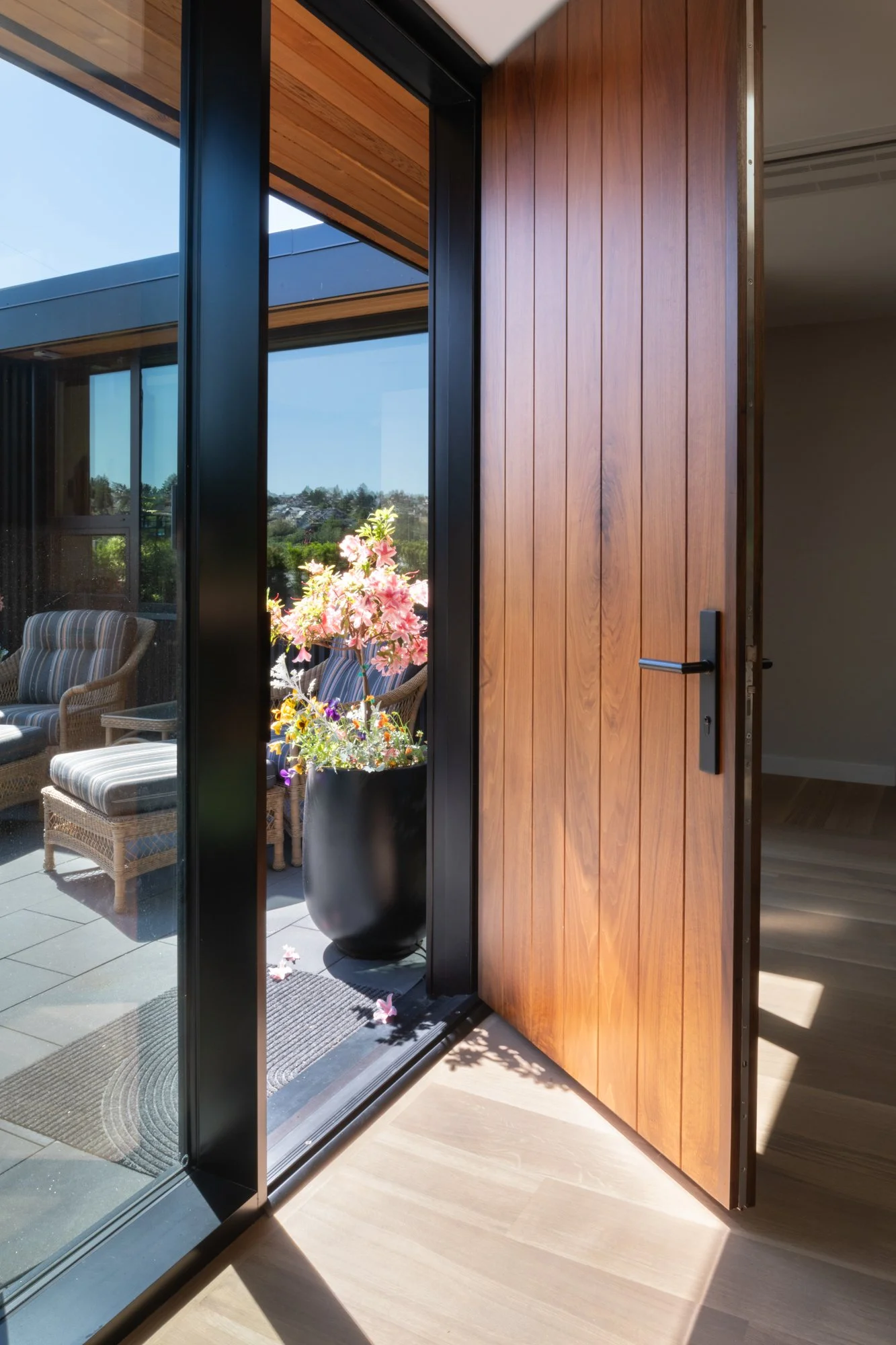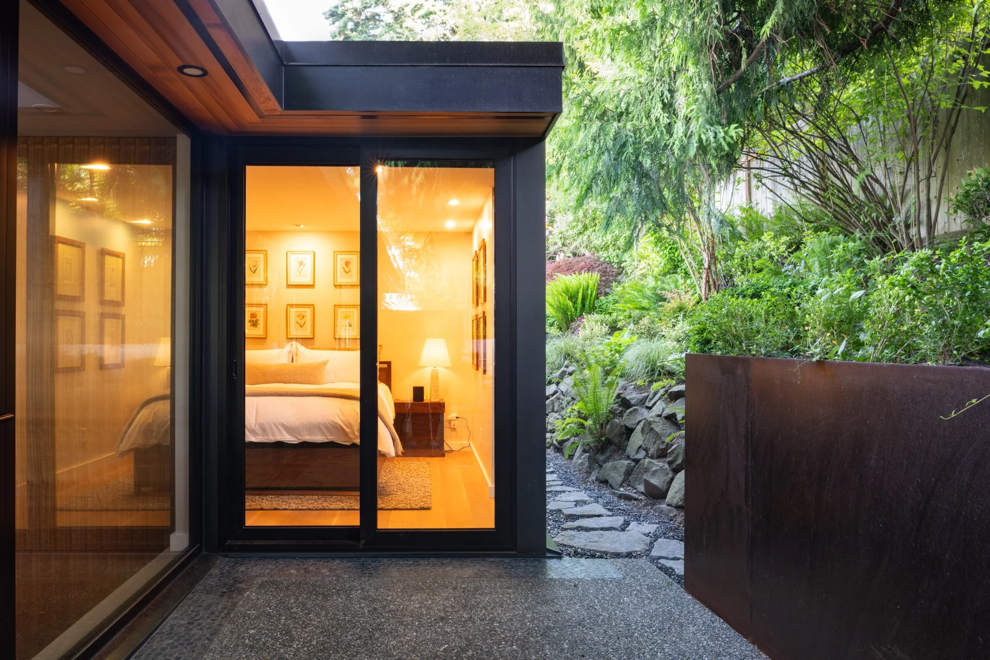 Key exterior elements include the striking shou sugi ban siding, a view-facing glass wall spanning one entire side of the home, and lush landscaping. The custom house numbers—milled directly into the siding in CAST's own shop—were inspired by Johansen's early design sketches found in the home.