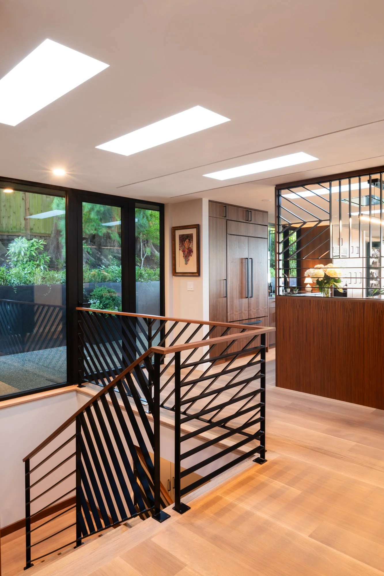 Inside, a continuous line from the remodeled kitchen to the original fireplace unifies the space. Geometric metalwork, warm walnut cabinetry, quartz countertops, and multiple skylights bring texture and richness to the interiors. The primary suite and study keep all of the main living spaces on the main floor. The lower level features an exercise room and a guest suite with a separate entrance, where the original brick is stained black to create a dramatic, modern contrast.