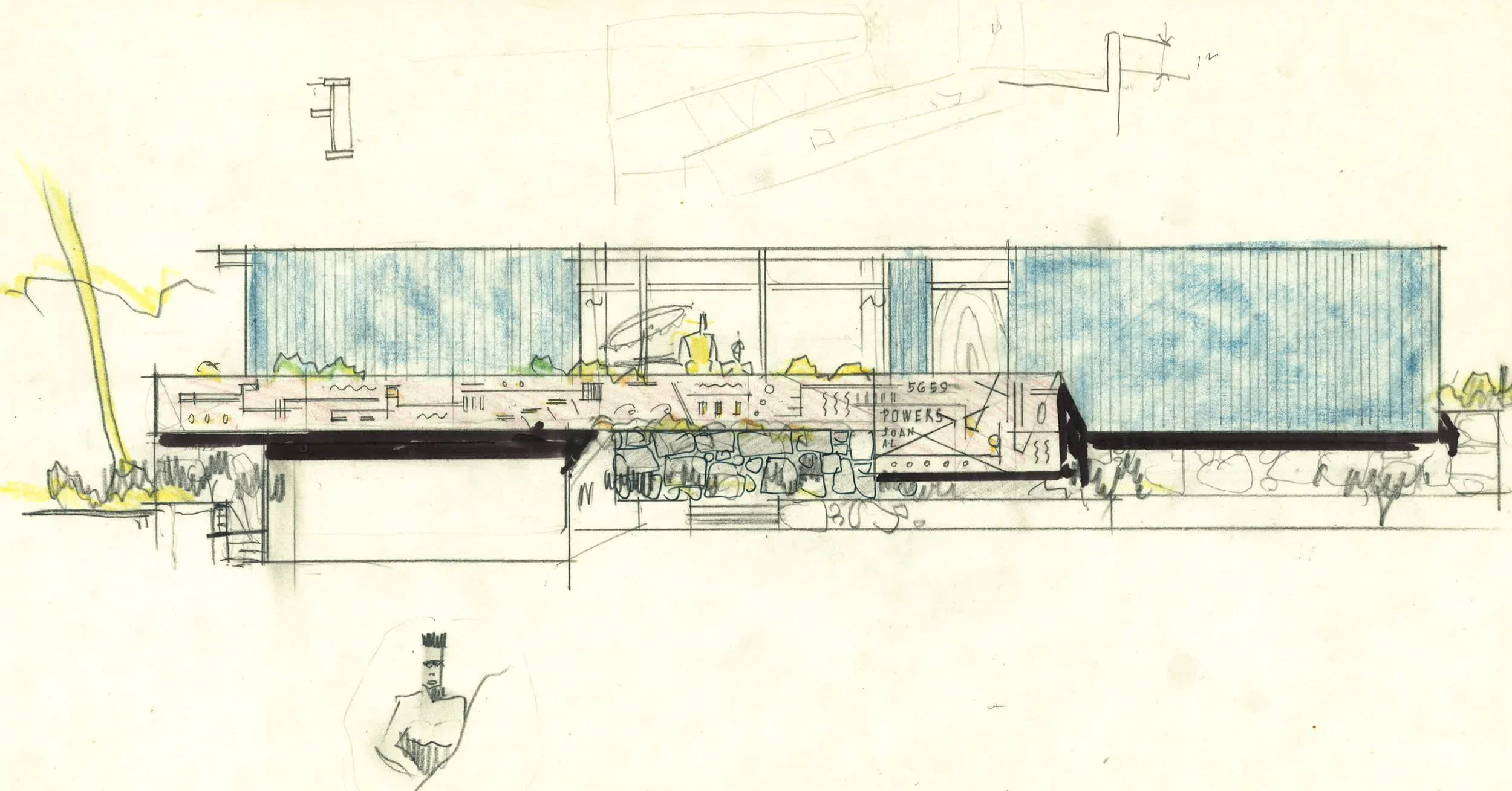 Built in 1959 by midcentury NW architect Art Johansen (sketch at left), the Shilshole Residence is a study in modernist principles adapted to local materials. Wood-clad walls running parallel to the street create a series of interlocking volumes connected by glass voids. This thoughtful renovation maintains the home's unique character while providing comprehensive updates to both interior finishes and exterior envelope.